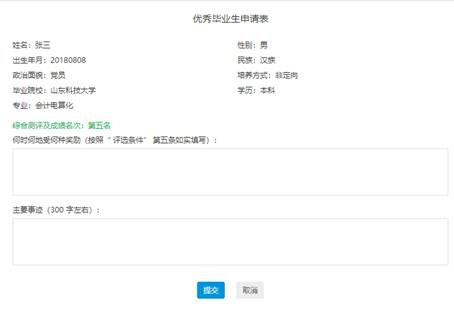 功能描述:實現山東省內院校畢業生《優秀畢業生評審表》內容填寫功能。