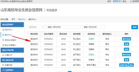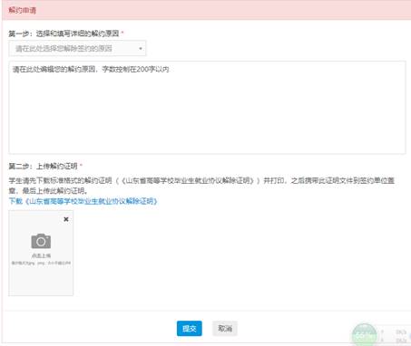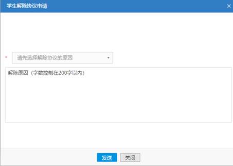 2、錄入協議解除:協議書生效后,由學生填寫解約原因,上傳解約證明后提出解約申請,等待學校審核結果,審核通過協議解除,審核未過協議仍有效。