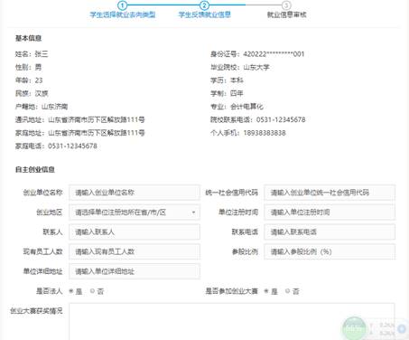 操作說明:學生如果自主創業,則選擇選擇自主創業類型,在界面按要求填寫自主創業信息并上傳證明材料。如有不確定信息可保存,暫不提交,確認無誤信息可保存并提交審核,也可以取消本次操作返回重新選擇就業去向。
