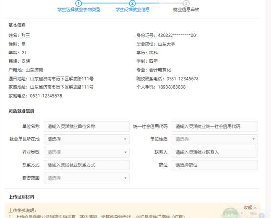 操作說明:學生如果與單位靈活就業方式就業,則選擇選擇靈活就業類型,在界面按要求填寫靈活就業信息并上傳證明材料。如有不確定信息可保存,暫不提交,確認無誤信息可保存并提交審核,也可以取消本次操作返回重新選擇就業去向。