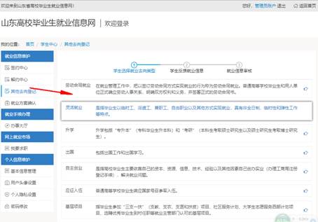 功能描述:實現省內院校畢業生簽訂就業協議之外的畢業去向信息登記功能。包括勞動合同就業、靈活就業、升學、出國、自主創業、應征入伍和基層項目就業七種去向。