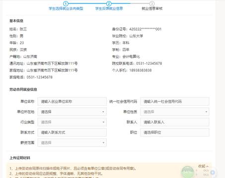 操作說明:學生如果與單位簽訂合同方式就業,則選擇選擇勞動合同就業類型,在界面按要求填寫勞動合同就業信息并上傳證明材料。如有不確定信息可保存,暫不提交,確認無誤信息可保存并提交審核,也可以取消本次操作返回重新選擇就業去向。