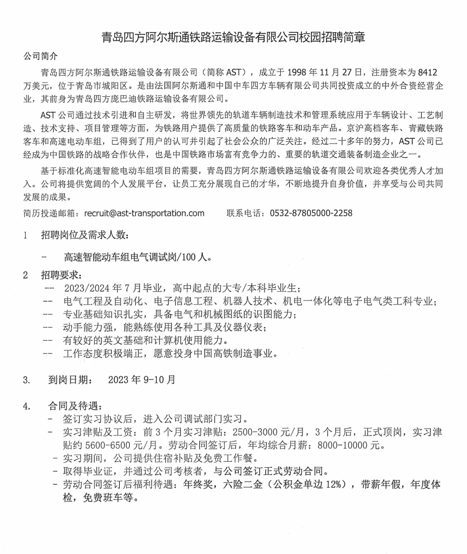 青島四方阿爾斯通鐵路運輸設備有限公司校園招聘簡章