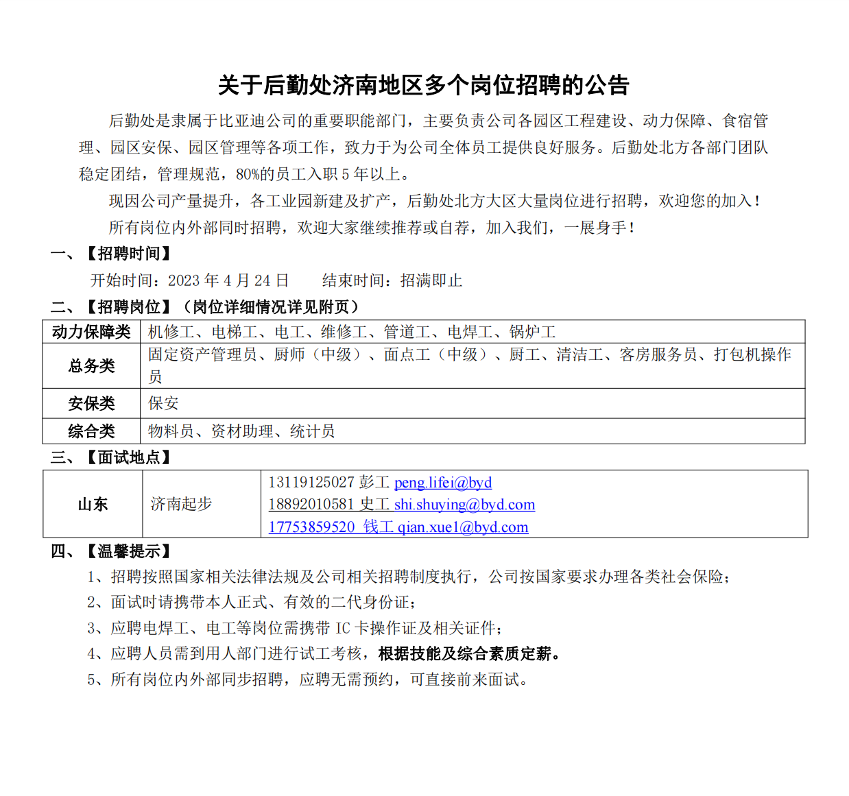 比亞迪公司關于后勤處濟南地區多個崗位招聘的公告
