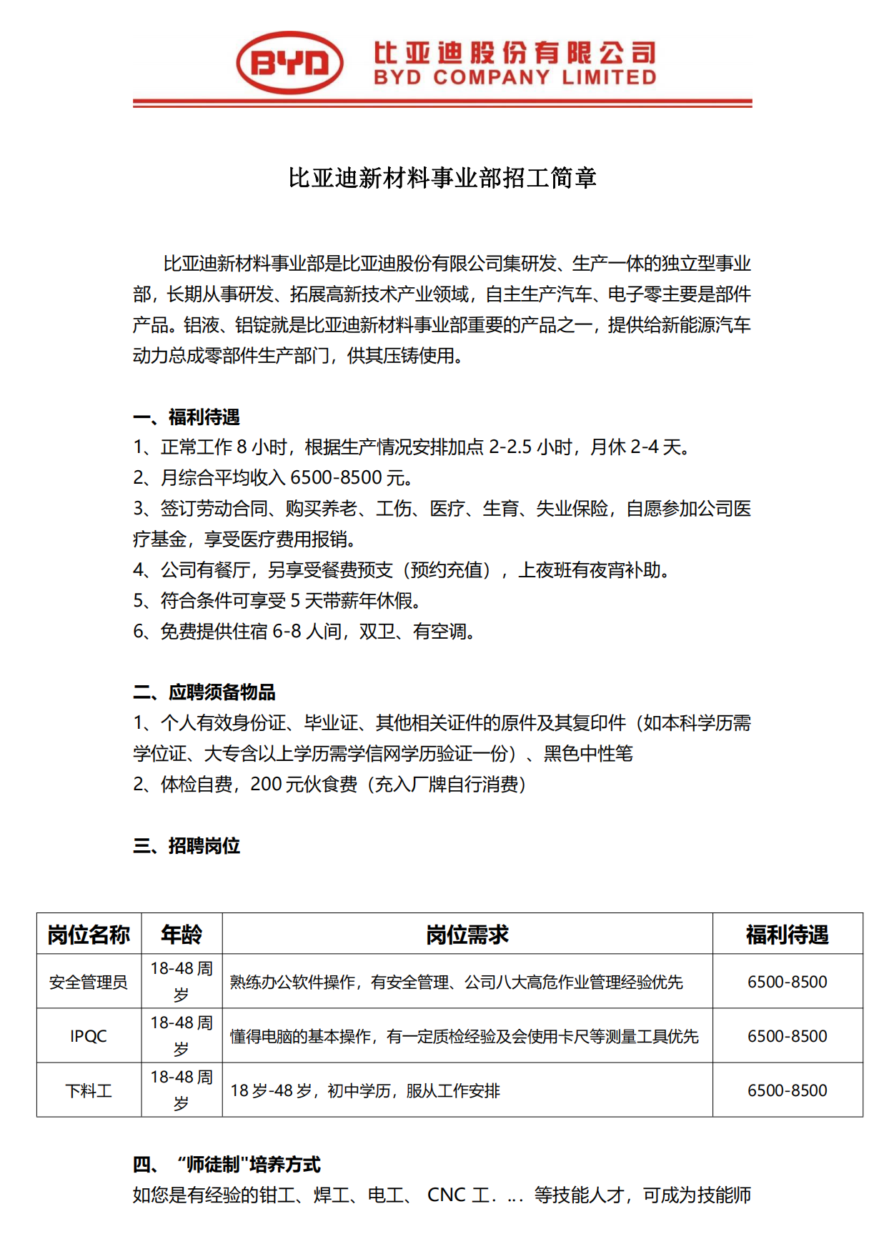 比亞迪新材料事業部招工簡章