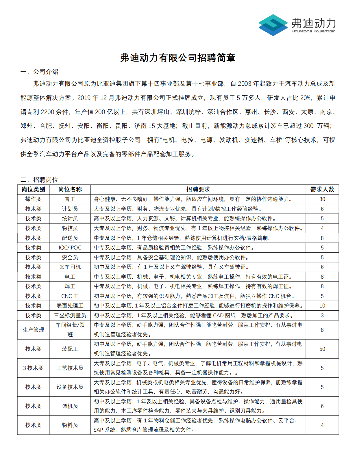 弗迪動力有限公司招聘簡章