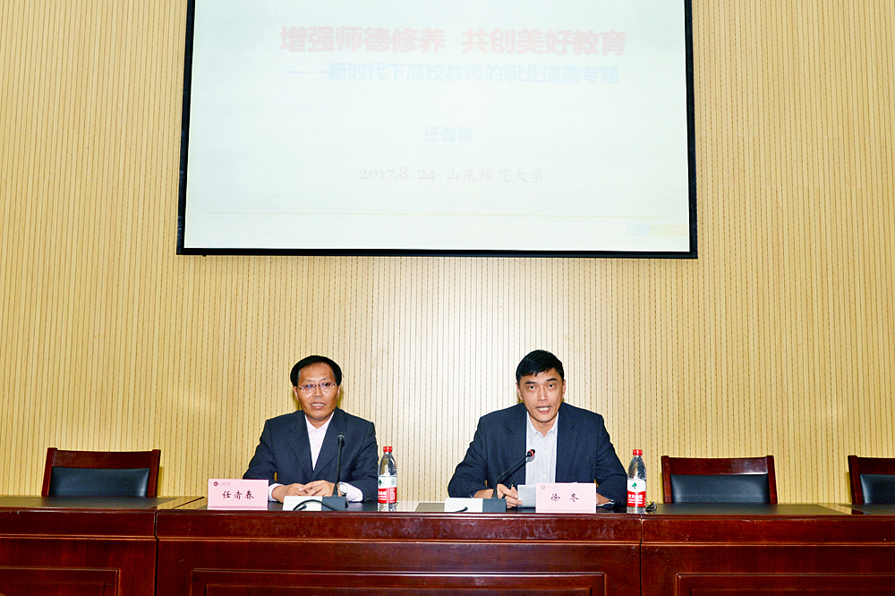 為進一步堅定廣大教師職業信念和職業操守,提高師德踐行能力,不斷激發教師的職業榮譽感和教書育人的積極性、創造性,10月19日下午,我院舉辦“增強師德修養,共創美好教育”師德教育報告會,邀請山東省高校十大師德標兵、山東師范大學碩士生導師任者春教授做客報告廳,與廣大教師面對面談師德、話教育。學院黨委副書記徐冬主持報告會。