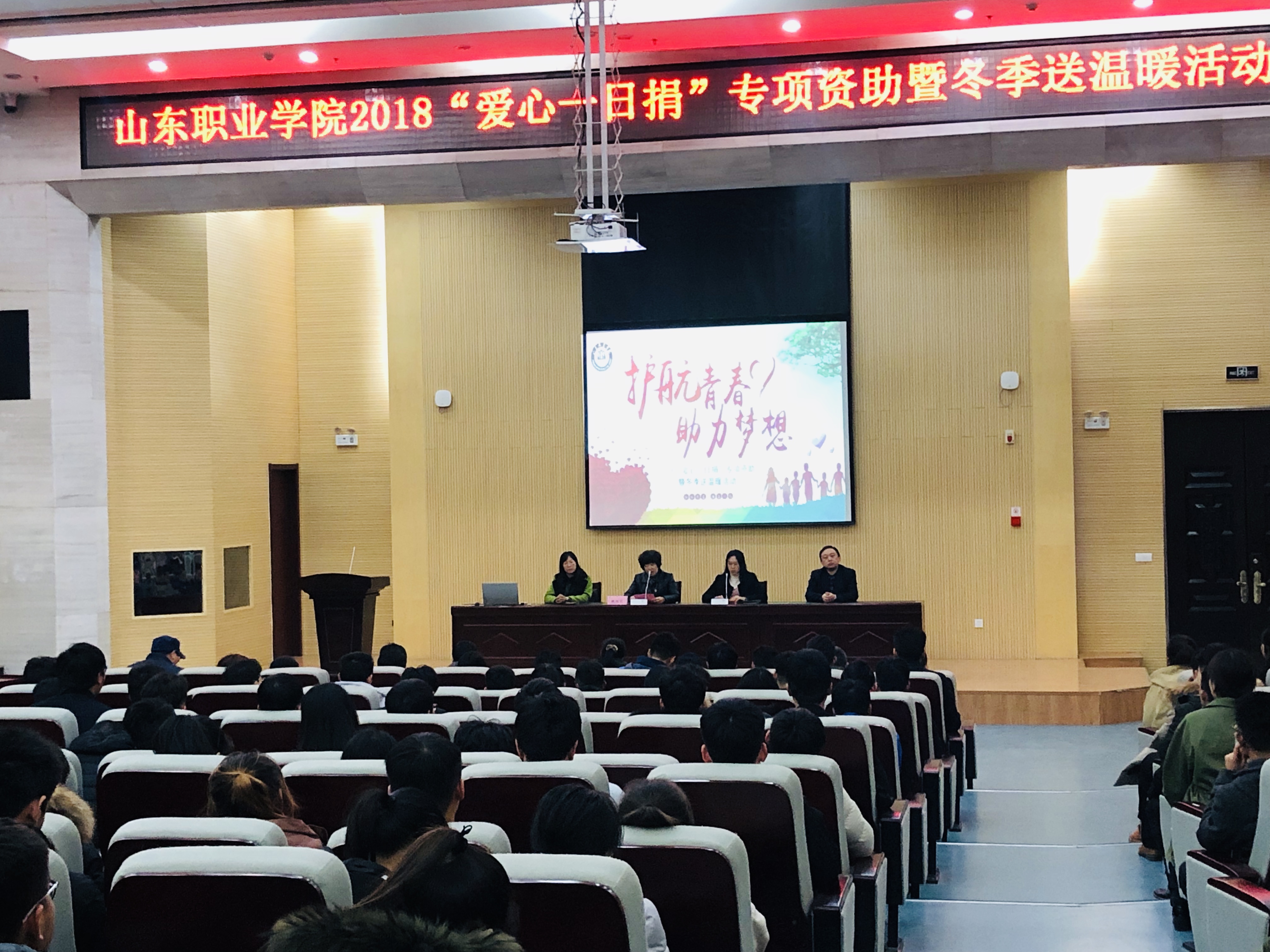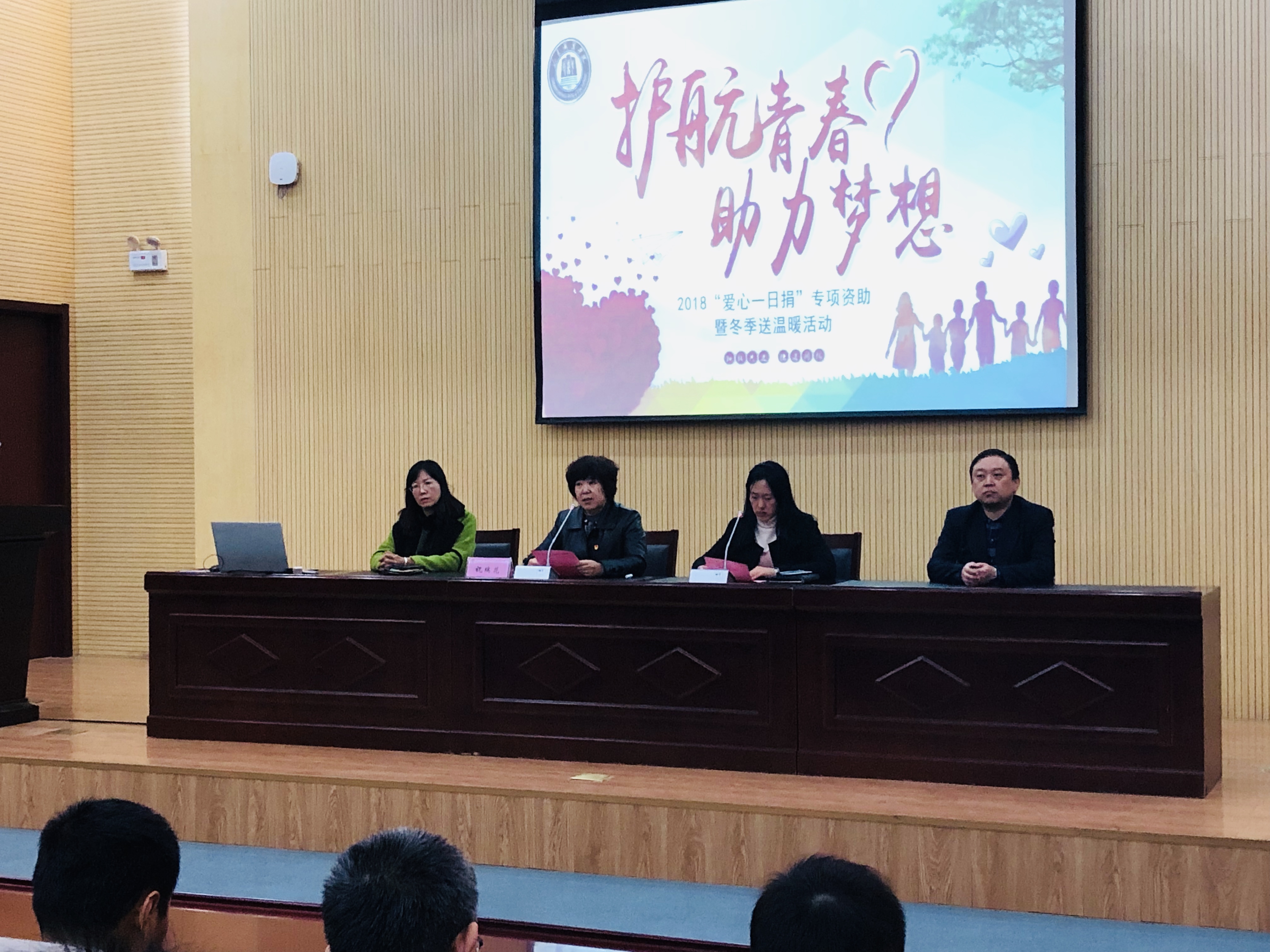 12月26日中午,我院舉行了“護航青春,助力夢想”——2018“愛心一日捐”專項資助暨冬季送溫暖活動。副院長祝瑞花出席活動并講話,學生工作處處長劉紅、副處長王寧、工會副主席趙欣及各系書記、學工辦主任、資助負責老師和全體受資助學生200余人參加活動。