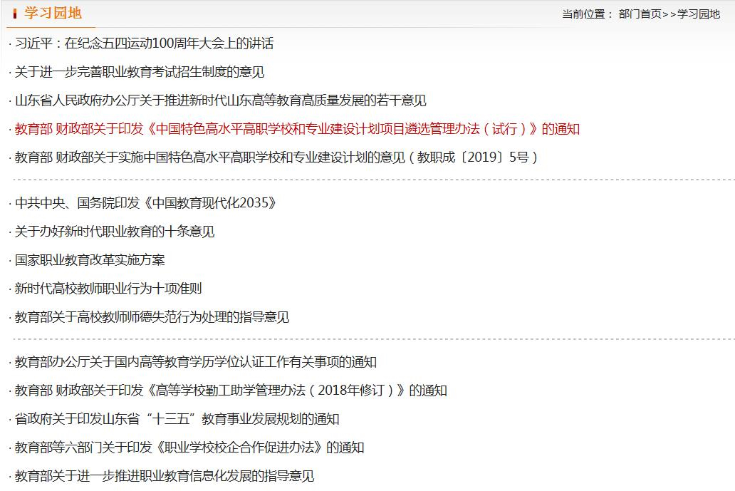 學院大力加強宣傳工作,堅持宣傳方針政策、宣傳發展成果、宣傳職教故事相結合。黨委(學院)辦公室在學習園地轉載《習近平總書記在紀念五四運動100周年大會上的講話》《中國教育現代化2035》《關于辦好新時代職業教育的十條意見》《國家職業教育改革實施方案》《新時代高校教師職業行為十項準則》《教育部關于高校教師師德失范行為處理的指導意見》《山東省人民政府辦公廳關于推進新時代山東高等教育高質量發展的若干意見》《中國特色高水平高職學校和專業建設計劃項目遴選管理辦法(試行)》《教育部財政部關于實施中國特色高水平高職學校和專業建設計劃的意見》等重要講話和政策文件。