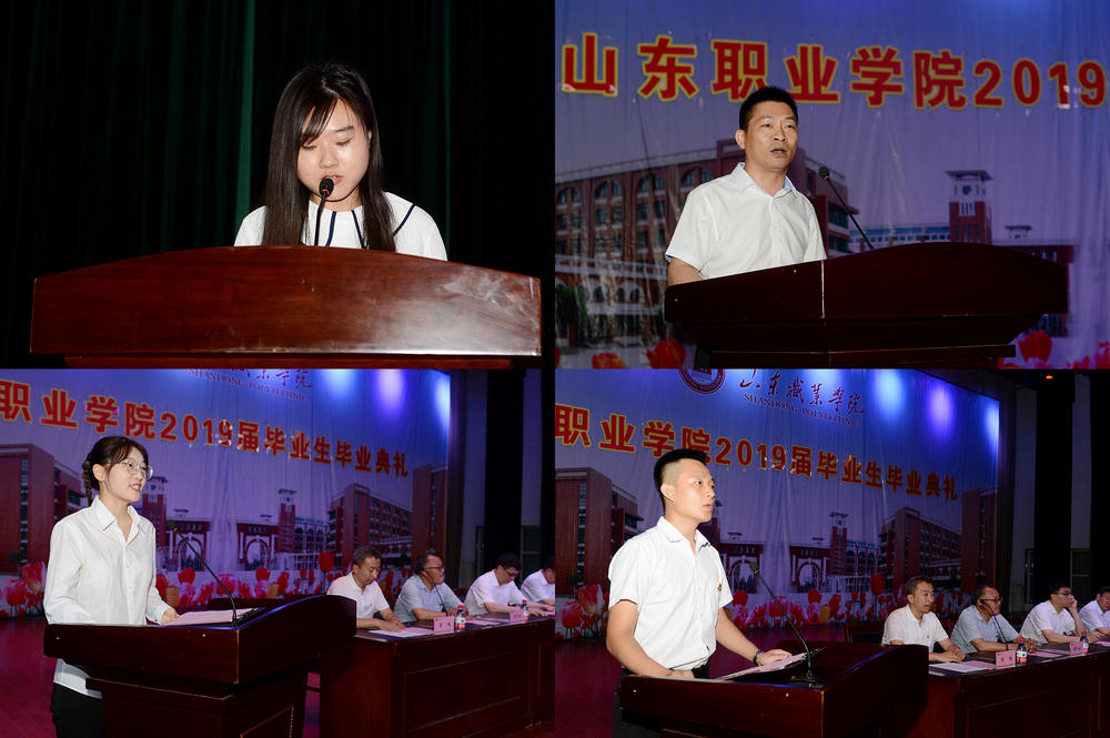 畢業典禮上,副院長郭鵬宣讀了《山東職業學院關于準予2019屆畢業生畢業的決定》,黨委副書記徐冬宣讀了《山東職業學院關于表彰2019屆優秀畢業生的決定》,學院領導向畢業生代表頒發了畢業證書,向優秀畢業生代表頒發了榮譽證書,向外國留學生頒發了學習經歷證書。