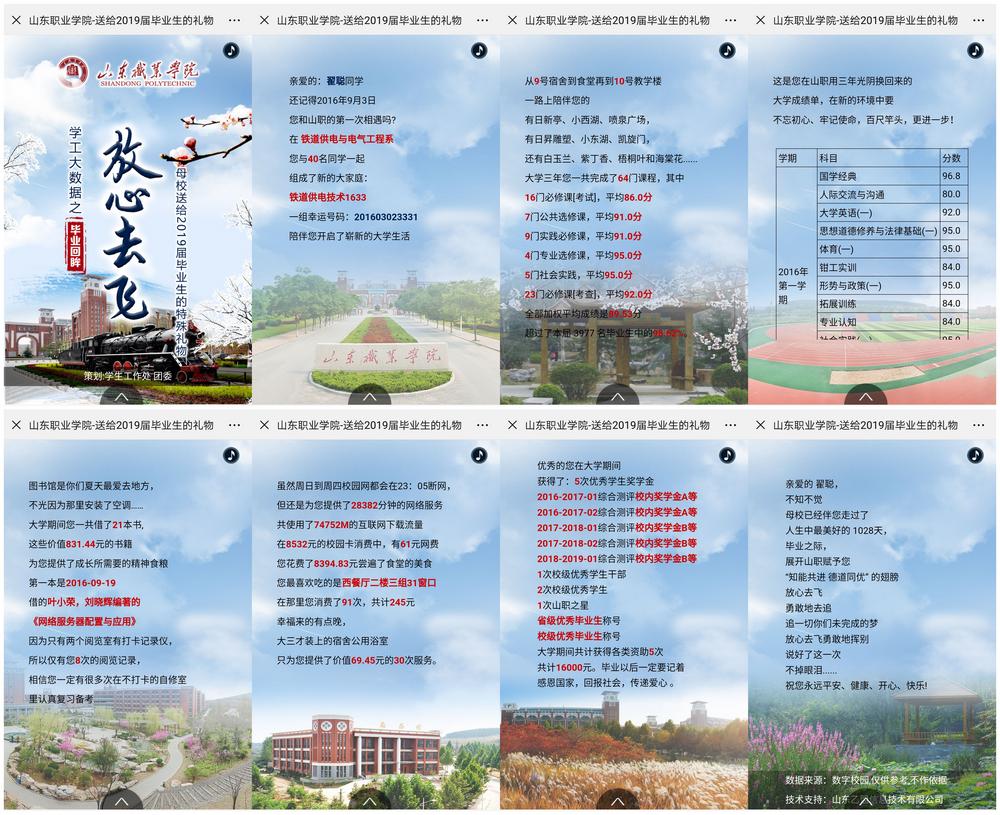 在這份特殊禮物的背后,是學院學生工作處、信息中心、教務處、圖書館與合作公司近一年的技術準備,學院大學生大數據平臺集成了學工、教務、校園卡、圖書、網絡認證計費等多個業務系統的學生成長數據,從近5屆學生的四千多萬條日常數據中對2019屆畢業生的兩千萬條數據進行了清洗、梳理與整合,從中提煉出了五十余萬條學生感興趣的數據,通過微信把每個人的數據精準推送給畢業生。