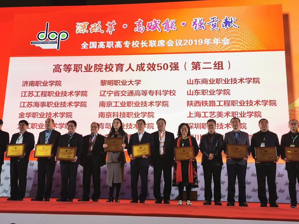 11月22日至23日,郭鵬副院長帶隊,科技處處長李新華、督導處處長牟萬全、教務處副處長張欣一行四人參加了在重慶召開的全國高職高專校長聯席會議2019年年會。會議同期舉辦了高職院校育人成效50強、服務貢獻50強等職業教育獎項頒獎儀式,我院榮膺高職院校育人成效50強,郭鵬代表學院上臺領獎接受表彰。該榮譽的取得,體現出教育部對我院全面落實立德樹人根本任務,切實提高育人質量所做工作的極大肯定。會議期間,還舉辦了職業教育與繼續教育扶貧專項工作交流活動,舉辦了高等職業教育改革發展成果展、高等職業院校技術研發與應用成果展。