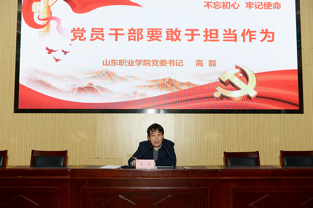 高磊首先通過回顧習近平總書記關于擔當作為的重要論述,強調了擔當是共產黨人的政治品格,是踐行黨的初心和使命的要求,是全心全意為人民服務的宗旨要求,只有堅持一切為了黨和人民事業,敢于較真碰硬,講實話、干實事才是真擔當。隨后,高磊指出信仰堅定、能力過硬和作風務實是黨員干部擔當作為應當具備的基本素質。最后,高磊結合前期調研情況和我院實際,從貫徹黨委領導下的校長負責制、堅持以學生為中心的發展理念、堅持以教師為主體的辦學思路等方面談了我院今后發展的一些設想。