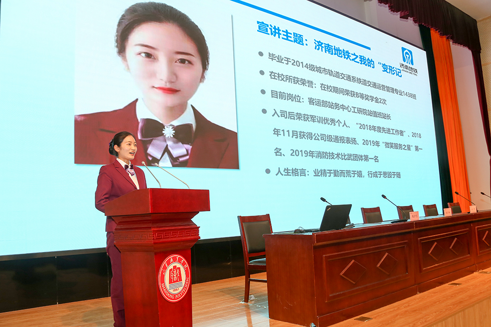 濟南軌道交通集團運營公司副總經理趙白雪、學院院長秦河、學院黨委副書記徐冬、招生就業處處長張少飛出席活動。濟南軌道交通集團運營公司辦公室宣傳主管張子楓通過視頻、PPT等形式,以“安全地鐵、綠色地鐵、智慧地鐵、品質地鐵”為主題,詳細詮釋了企業理念與企業文化。學院往屆畢業生優秀員工代表作了經驗分享交流。2017級、2018級濟南地鐵訂單班全體學生參加活動。