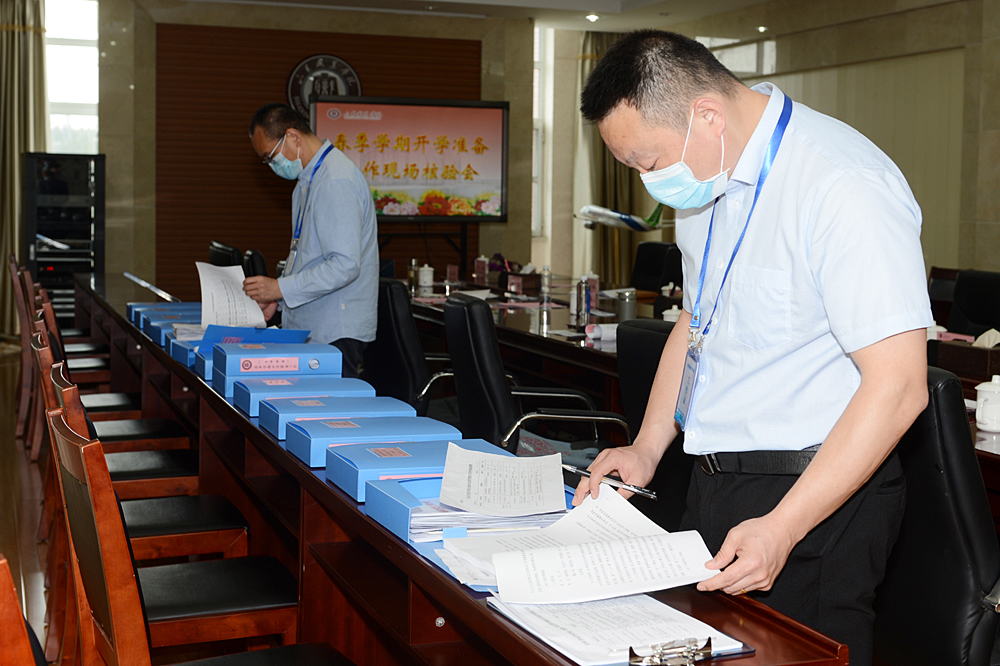 核驗專家組仔細查閱了學院防控工作檔案材料,圍繞《山東省高等學校2020年春季學期開學條件核驗細則》要求,對學院開學方案制定、相關防控機制建立、專項制度建設、教職工管理與全員培訓、應急處置、物資保障、清潔消毒、隔離區域、餐飲管理、宿舍管理、錯峰返校、校園出入管理、教學準備等方面的情況進行了全面、細致的調研、核驗。專家組成員在查看相關設施、資料的同時,就相關問題向現場人員詢問了工作流程、做法。