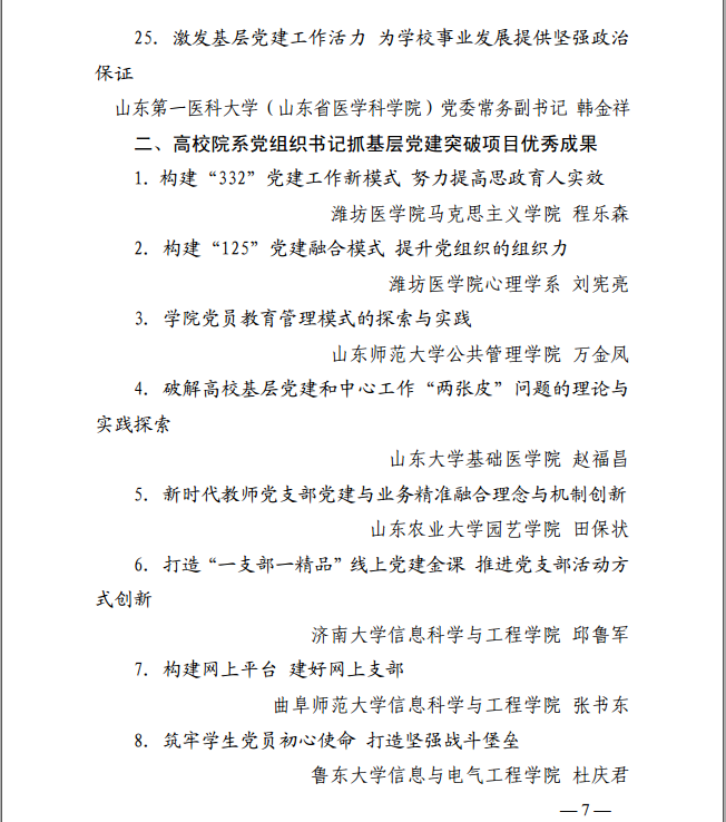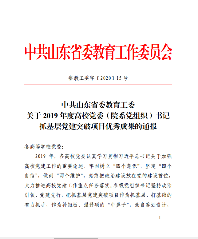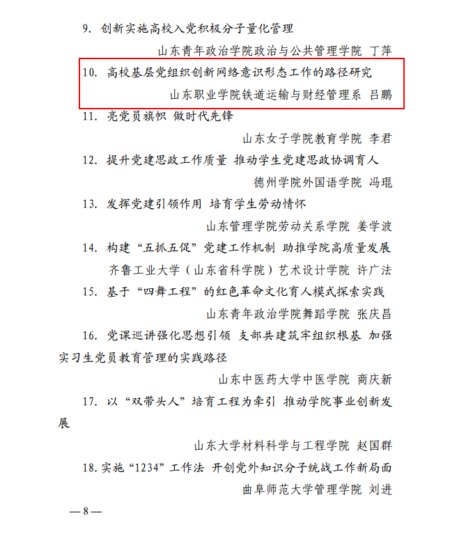 近日,中共山東省委教育工委發文,對全省25個高校黨委書記抓基層黨建突破項目優秀成果和25個高校院系黨組織書記抓基層黨建突破項目優秀成果進行了通報表揚。我校鐵道運輸與財經管理系黨總支書記呂鵬同志抓基層黨建突破項目成果《高校基層黨組織創新網絡意識形態工作的路徑研究》被評選為優秀成果。