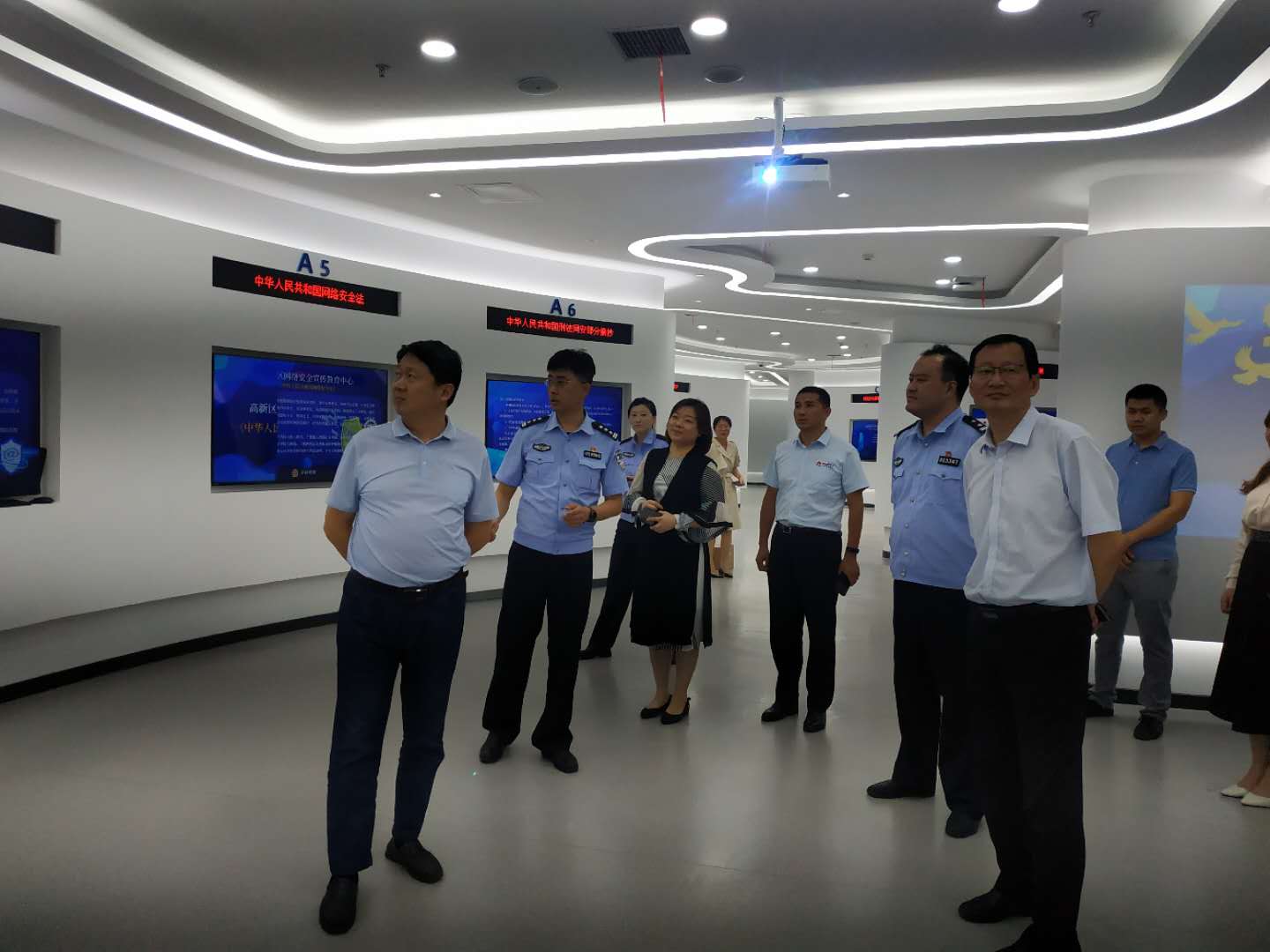李攀對郭培謙一行的到訪表示歡迎,并簡要介紹了濟南市公安局高新分局網警工作的基本情況,帶領參觀了濟南市公安局在高新區人工智能大廈建設的“網絡安全宣教中心”。中心負責人員還介紹了“楓橋式”互聯網智慧園區的基本情況,分享了有害信息防控和網絡輿情的發現與處置等方面的經驗。