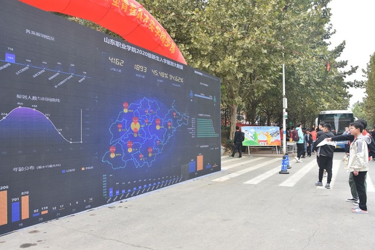 學校迎新生報到工作因“大數據”而更加高效周到,廣昆路上的電子大屏幕隨著新生陸續報到,實時更新顯示已報到人數、各專業報到情況、新生的姓氏、生源地分布等數據,引來新生和家長們不斷駐足圍觀。
