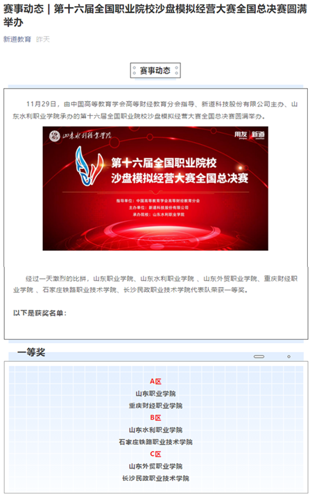 11月29日,第十六屆全國職業院校沙盤模擬經營大賽全國總決賽落下帷幕。我校代表隊斬獲A區全國一等獎第一名的好成績,這是我校首次在該賽項中進入國賽并獲得一等獎。