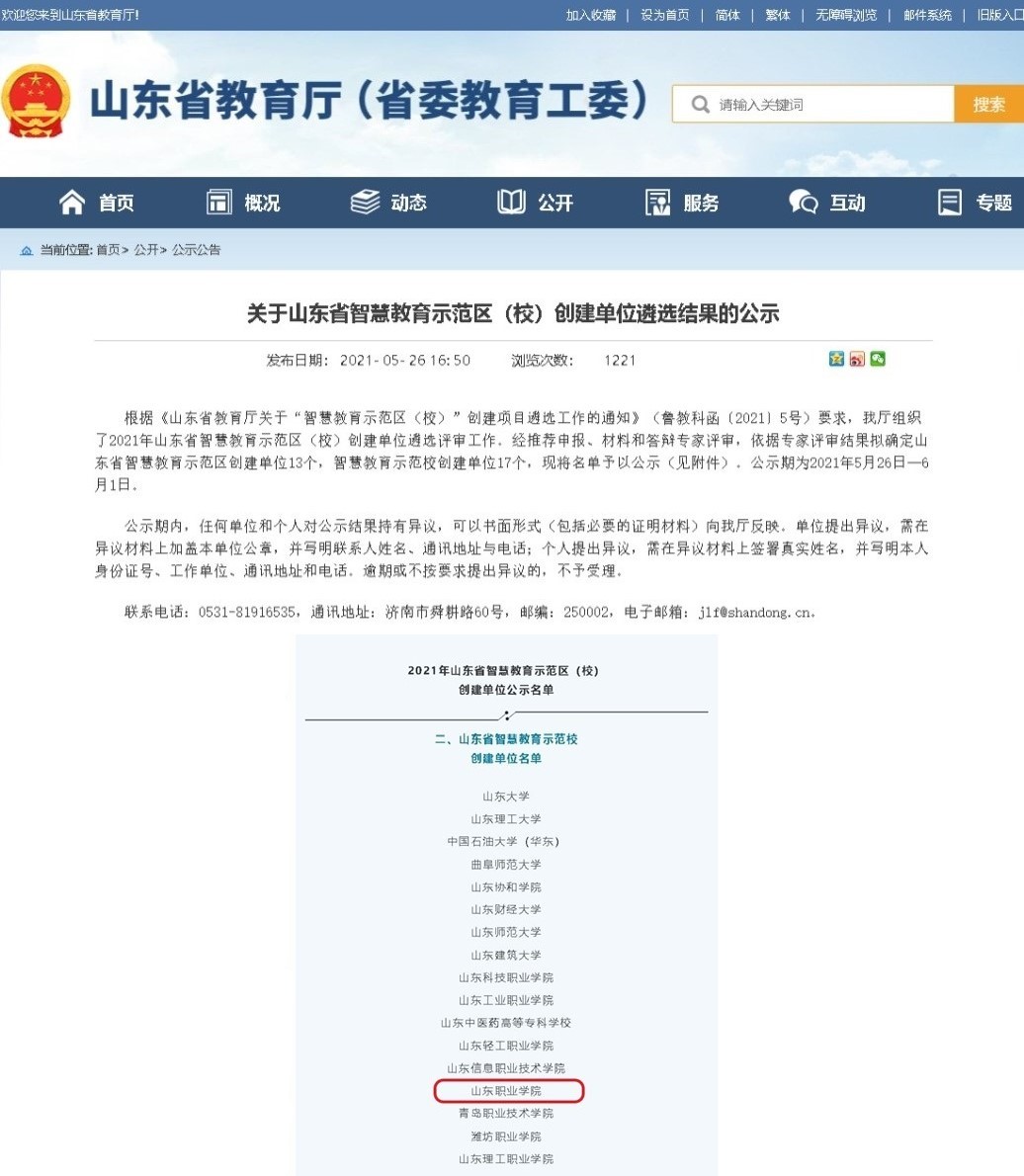 5月26日,山東省教育廳網站公示了山東省智慧教育示范區(校)創建單位遴選結果,我校獲評智慧教育示范校創建單位。