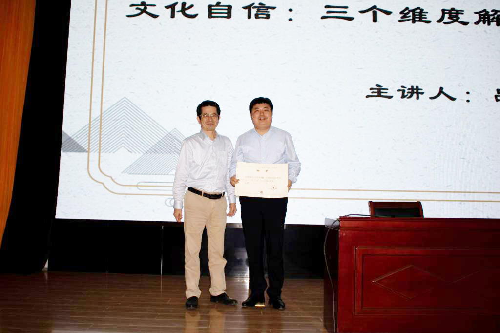 呂文明教授以《文化自信:三個維度解讀中華優秀傳統文化》為主題做了報告。他以2013年習近平總書記視察山東曲阜和2018年在全國宣傳思想工作會議上提出的“四個講清楚”為切入點,從長度、厚度、高度三個維度對中華優秀傳統文化進行了解讀,通過中華優秀傳統文化的深厚土壤和歷史積淀,引導師生共同感受中華優秀傳統文化的魅力所在。