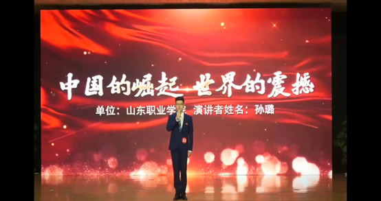 孫璐講述了一個積弱積貧的舊中國如何在中國共產黨的領導下發展為“文明型國家”,并結合中華文化元素展現了大國崛起帶給世界的震撼,闡釋了當代大學生對初心使命的理解和奮斗新時代的信心、決心。孫璐的精彩表現獲得了現場觀眾的熱烈掌聲,得到了現場評委的高度肯定。