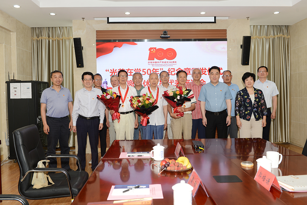 頒發“光榮在黨50年”紀念章工作是中國共產黨成立100周年慶祝活動的重要組成部分。今年是首次頒發,我校共有39位老黨員榮獲紀念章。許金亮、孔凡柱、馮國祥三位老黨員代表參加了本次頒發儀式。黨委書記高磊向老黨員代表頒發紀念章。