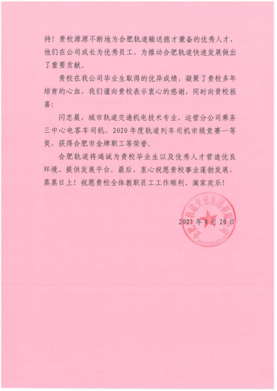 近日,我校收到一封來自合肥市軌道交通集團有限公司的感謝函。