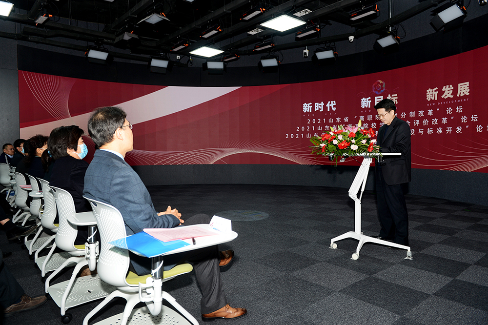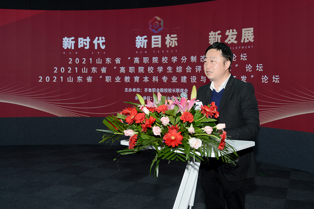 11月18日上午,由齊魯職業院校校長聯席會議主辦、我校承辦的山東省“職業教育本科專業建設與標準開發論壇”“高職院校學分制改革論壇”“高職院校學生綜合評價改革論壇”三個論壇在我校新建成的全景教室開幕。院長秦河致歡迎辭,省教育廳職教處副處長陳志浩出席并講話,全省各高職院校領導、教育教學管理人員、學生管理人員、專業帶頭人、骨干教師等通過線上線下相結合的方式參加論壇。開幕式由副院長王紹軍主持。