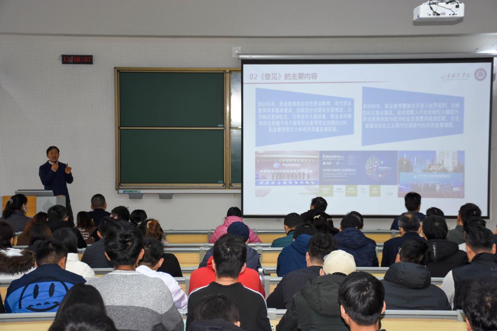 11月23日,副院長王紹軍以《貫徹黨的教育方針,做好教育教學改革——<關于推動現代化職業教育高質量發展的意見>學習解讀》為題給部分學生干部講授思政課。分管職能處室、聯系二級院部黨員隨堂聽課。
