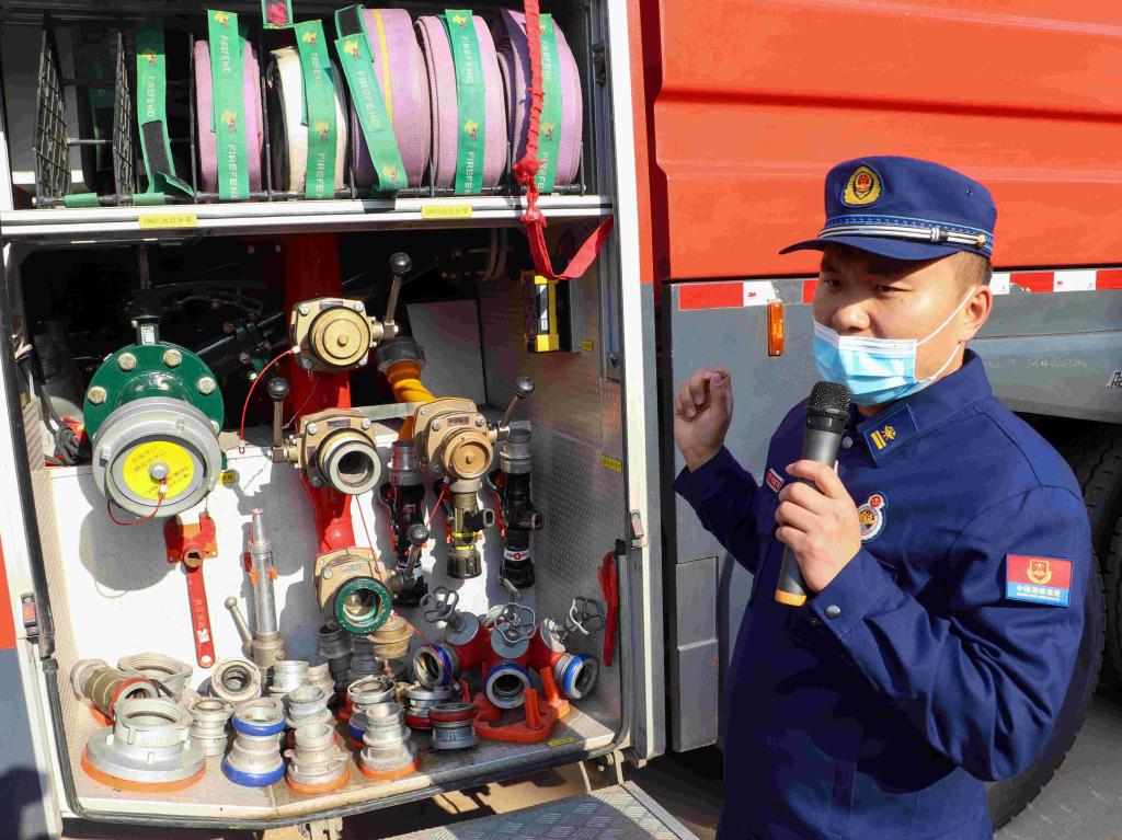 為讓大家更加形象地了解消防車是如何滅火的,孫村消防中隊現場開來了一輛水罐消防車,張隊長向大家講解了水罐消防車、泡沫消防車、搶險救援消防車的區別,還介紹了水罐消防車上各類設備的名稱和使用方法。