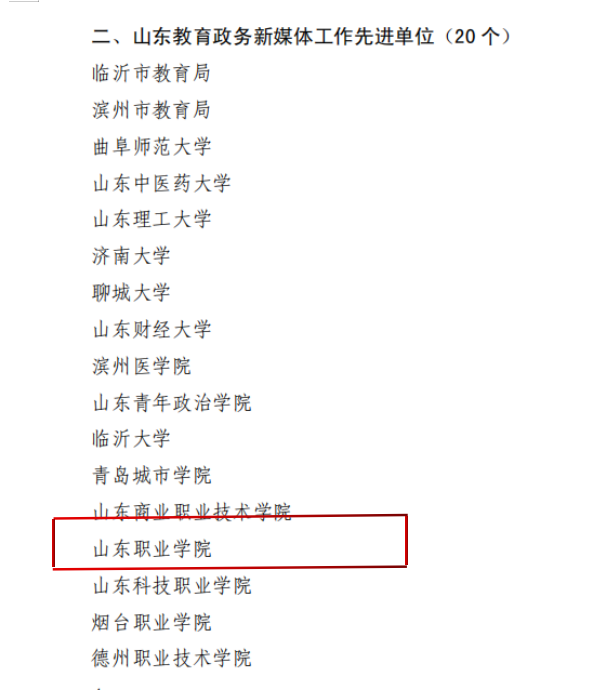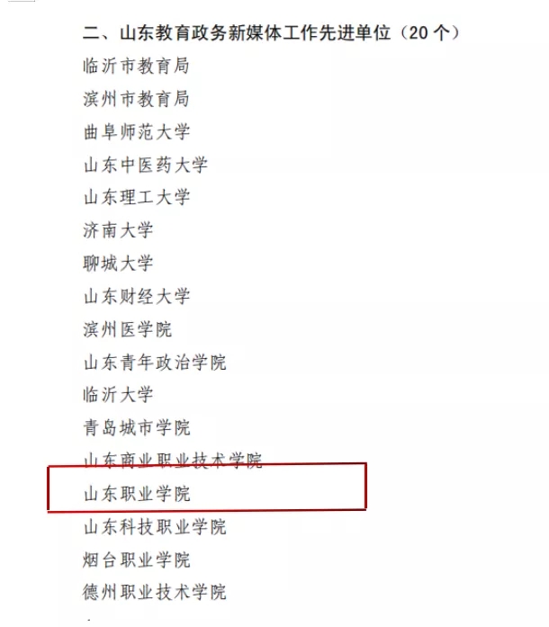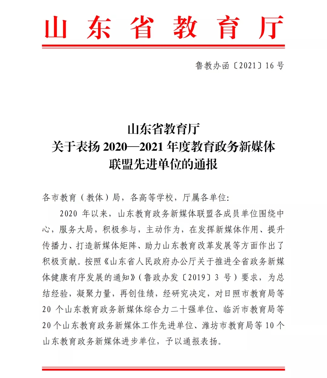 近日,山東省教育廳印發《山東省教育廳關于表揚2020—2021年度教育政務新媒體聯盟先進單位的通報》,我校榮獲“山東教育政務新媒體工作先進單位”稱號。