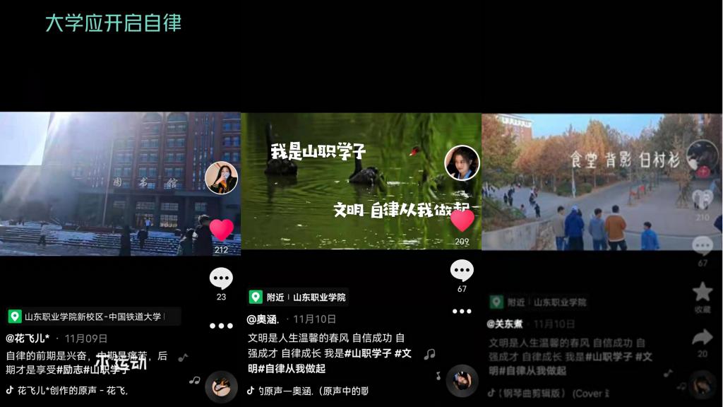 活動緊緊圍繞“培養懂技術、會生活、有品位的高素質創新型復合型技術技能型人才”的人才培養定位,結合“自律文明我倡議”“‘律’動青春”“‘三節’you 我踐行”“自持自得,律己律心”四個主題,開展了10余項活動。同學們積極為校園文明公約建言獻策,做學習表率,以實際行動節水、節糧、節電,提高人文素養。