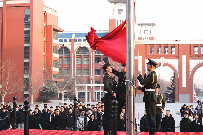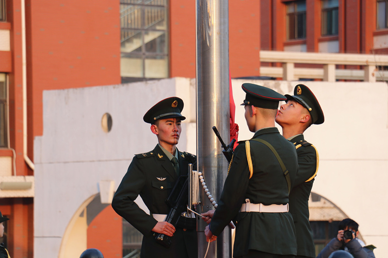 7點30分,國旗護衛隊目光如炬、步調一致,護送國旗入場。伴隨著激昂雄壯的《義勇軍進行曲》,旗手振臂一揮,鮮艷的五星紅旗在全體師生的莊嚴注目中冉冉升起。師生齊聲高唱國歌,傳遞著自己對祖國的熱愛和崇高敬意。
