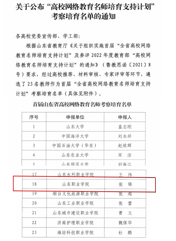 2月21日,山東省教育廳印發《關于公布“高校網絡教育名師培育支持計劃”考察培育名單的通知》,我校易安書院副院長張錦入選首屆山東省高校網絡教育名師培育支持計劃考察培育名單。