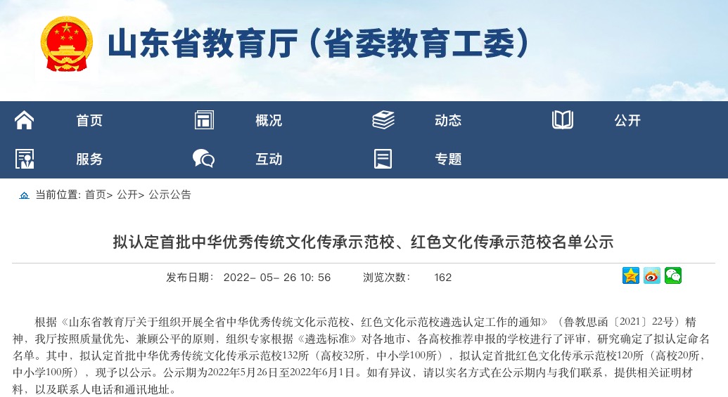 5月26日,山東省教育廳印發了《擬認定首批中華優秀傳統文化傳承示范校、紅色文化傳承示范校名單公示》,我校榮登榜單。