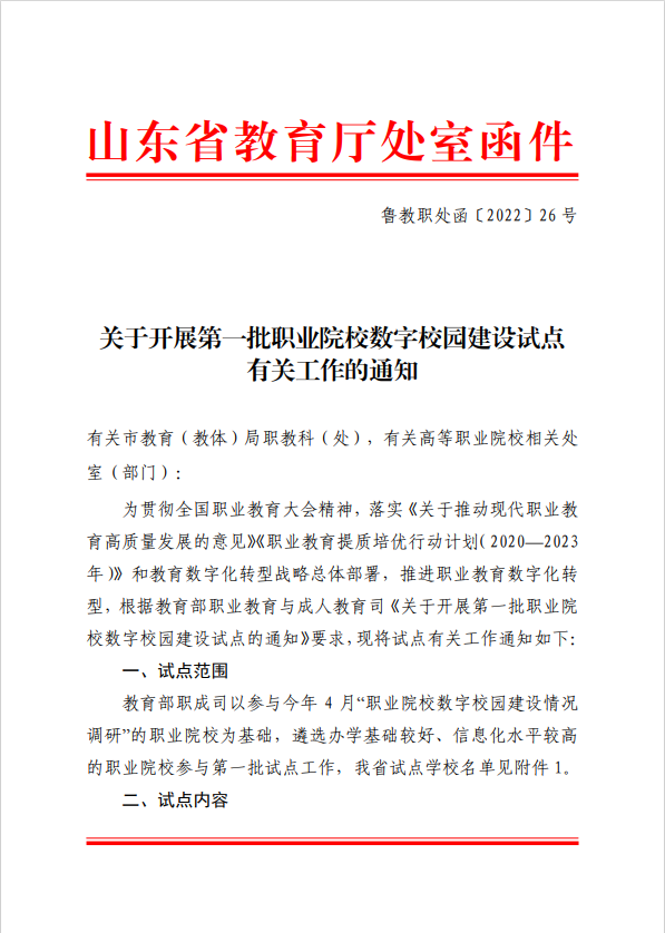 近日,山東省教育廳印發《關于開展第一批職業院校數字校園建設試點有關工作的通知》,遴選辦學基礎較好、信息化水平較高的職業院校作為第一批數字校園建設試點單位,我校成功入選。