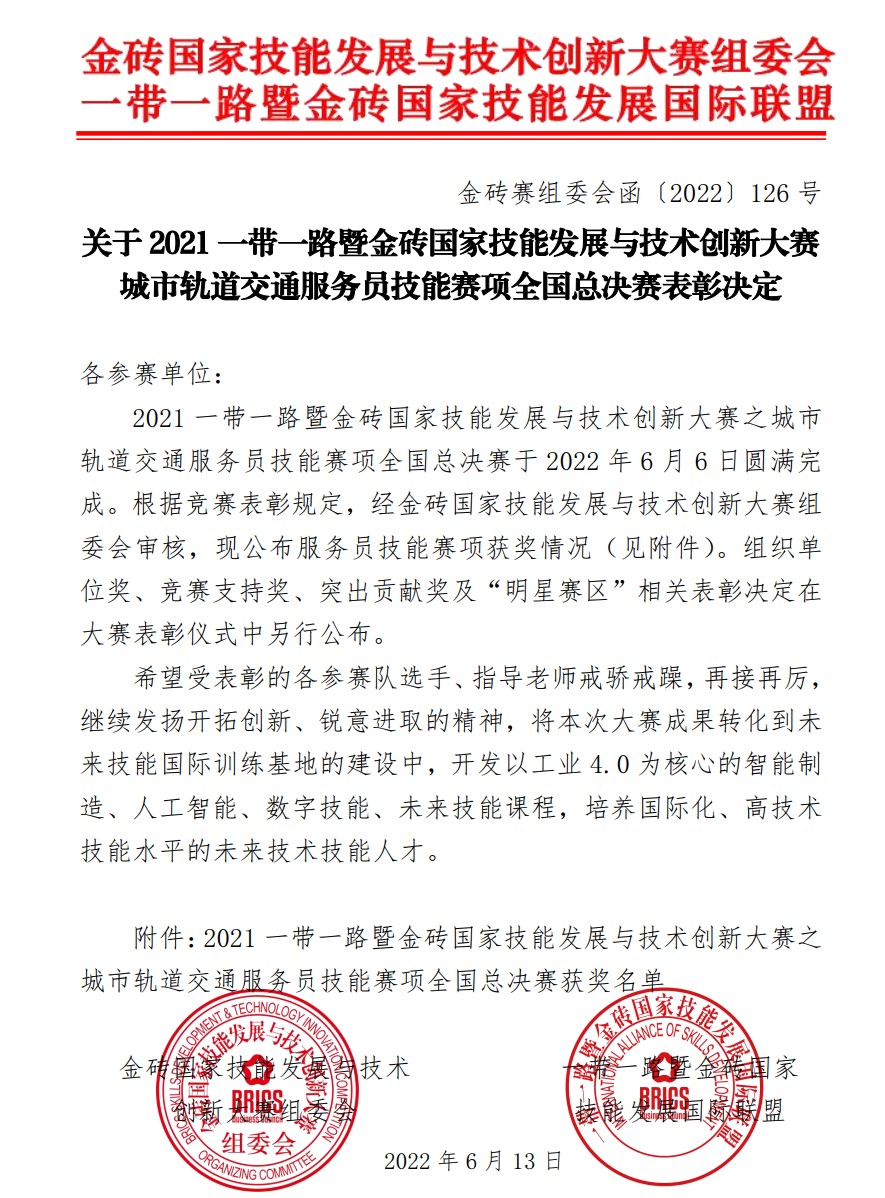 6月6日,2021一帶一路暨金磚國家技能發展與技術創新大賽之城市軌道交通服務員技能賽項全國總決賽圓滿完成。經過激烈角逐,我校城市軌道交通運營管理專業的兩支代表隊,分別斬獲“服務員”賽項和“行車值班員”賽項一等獎。