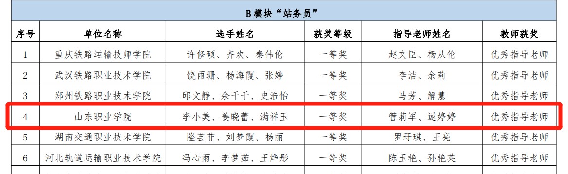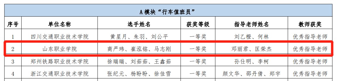 因疫情原因,全國總決賽由線下轉為線上,比賽內容和形式發生變化。我校指導老師和參賽同學以飽滿的熱情和堅韌不拔的精神,適應新的比賽形式,付出艱辛努力,經過數月準備,克服重重困難。最終由鄧麗君、匡榮杰老師指導的商嚴瑋、崔泓銘、馬志剛3名同學獲得“城市軌道交通行車值班員”賽項一等獎;由管莉軍、逯婷婷老師指導的李小美、姜曉蕾、滿祥玉3名同學獲得“城市軌道交通服務員”賽項一等獎。
