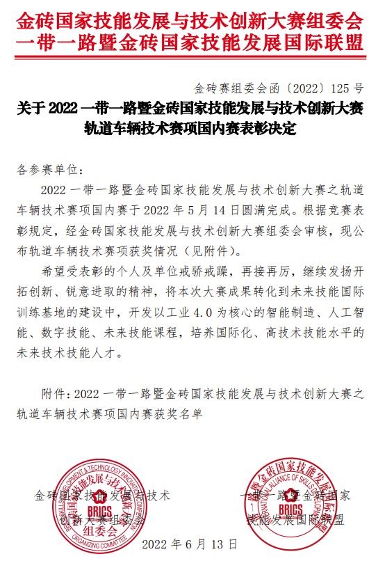 2022一帶一路暨金磚國家技能發展與技術創新大賽之軌道車輛技術賽項國內賽于5月14日圓滿結束。本次大賽共139支隊伍參加,經過激烈角逐,我校城市軌道車輛應用技術專業代表隊順利入圍國際賽,將作為40支中國代表隊之一參加2022年5月-11月舉辦的國際賽。