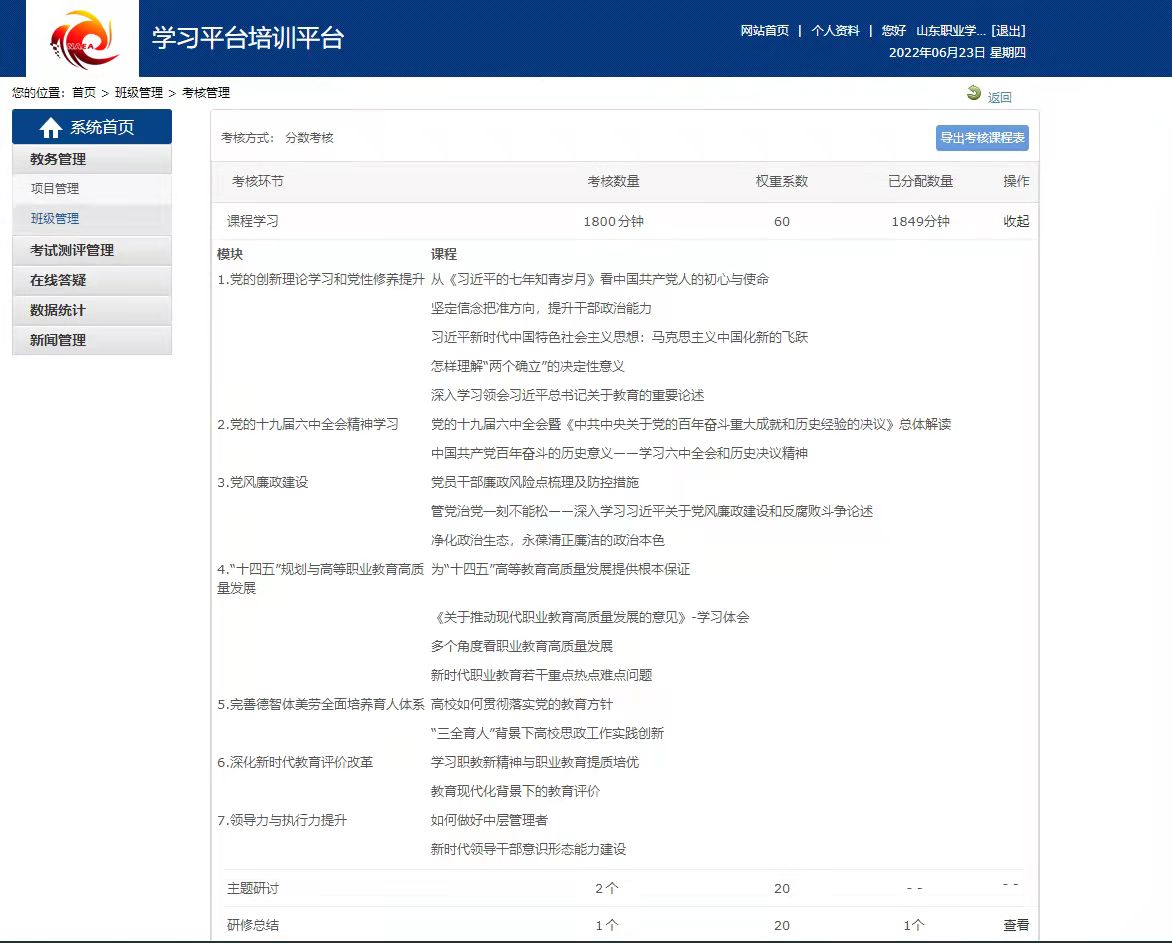 本次培訓依托國家教育行政學院中國教育干部網絡學院進行線上培訓,主要圍繞黨的創新理論學習和黨性修養提升、黨的十九屆六中全會精神、黨風廉政建設、“十四五 ”規劃與職業高等教育高質量發展、完善德智體美勞全面培養育人體系、深化新時代教育評價改革、領導力與執行力提升等七個方面設置課程,選聘專家,注意體現高職院校及高職院校領導干部的特點和需求,實效性和針對性強。培訓內容包括課程學習、主題研討和撰寫培訓心得體會三個環節,內容全面、豐富多樣。