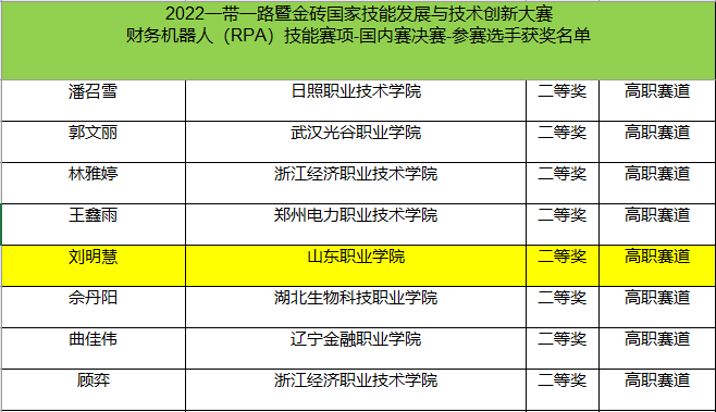 7月30日,由大數據與會計教研室主任劉春霞和李勉老師指導的學生參加了“2022一帶一路暨金磚國家技能發展與技術創新大賽財務機器人(RPA)技能賽項”,共有來自全國400所院校、1100名選手參加決賽,經過激烈角逐,取得了二等獎1個、三等獎2個和優秀獎1個,學校榮獲優秀組織獎。