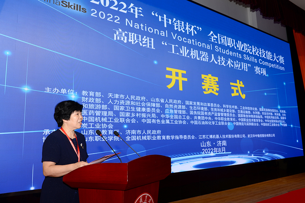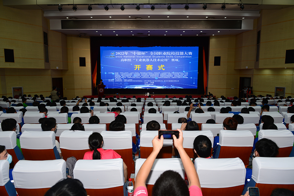 8月22日,2022年“中銀杯”全國職業院校技能大賽高職組“工業機器人技術應用”賽項開賽式在我校圖書行政樓西報告廳舉行。山東省教育廳職業教育處一級調研員孟令君,山東職業學院黨委書記高磊,賽項執委會副主任、山東交通職業學院黨委副書記、院長王心,大賽合作單位中國銀行股份有限公司濟南分行黨委委員、副行長郝學彬,賽項專家組長范進楨,裁判長熊越東,監督仲裁組長蔣曉剛,賽項執委會委員、江蘇匯博機器人技術股份有限公司副總裁崔曉輝,賽項執委會委員、武漢華中數控股份有限公司教育事業部副總經理寧柯出席開賽式。開賽式由學校副院長祝瑞花主持。