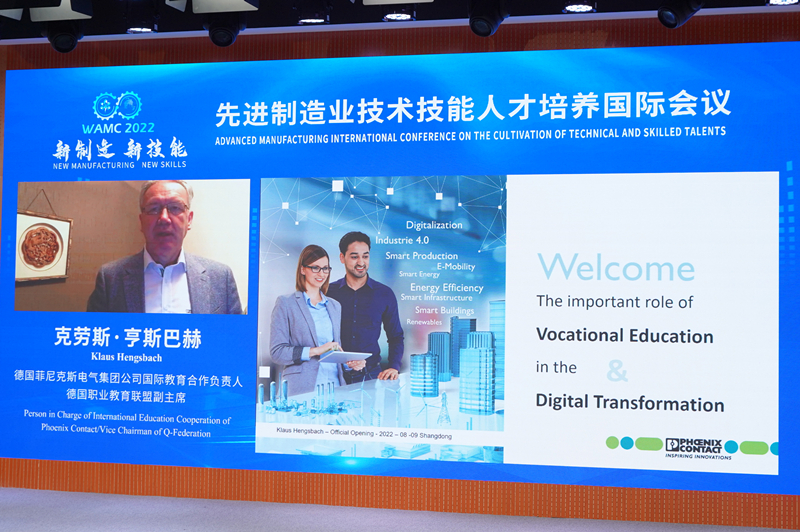 山東省教育廳職業教育處處長王志剛;德國巴登符騰堡州教育部專家、德國戈特利布·戴姆勒學院數據科學學院院長安德烈亞斯·威爾斯坦;德國菲尼克斯電氣集團公司國際教育合作負責人/德國職業教育聯盟副主席克勞斯·亨斯巴赫;中國智能制造專委會專家/e-works數字化企業網總編、CEO 黃培;德國菲尼克斯電氣中國公司副總裁、總工程師/中國自動化學會理事杜品圣;美國普渡大學材料科學與工程專業教授王曉明;德國國家科學與工程院院士葛興福通過線下與線上方式作了精彩的專題報告。