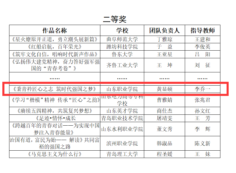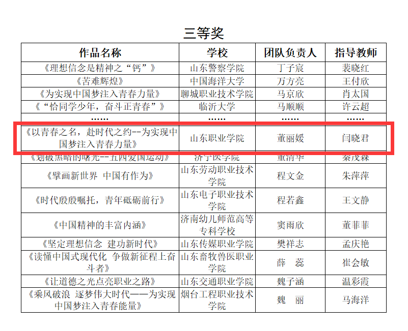 其中,由王楠、丁亞盼、索敏擔任指導教師,學生賈明揚、陳翔宇、張高健、宋鴻杰創作的作品《從核酸貼紙看中華優秀傳統文化的“兩創”》獲得省一等獎;由教師李喬一、張燕青、苑承麗指導的作品《秉青衿匠心之志 筑時代強國之夢》獲得省二等獎;由教師閆曉君、段潔、侯成飛指導的作品《以青春之名,赴時代之約——為實現中國夢注入青春力量》獲得省三等獎。