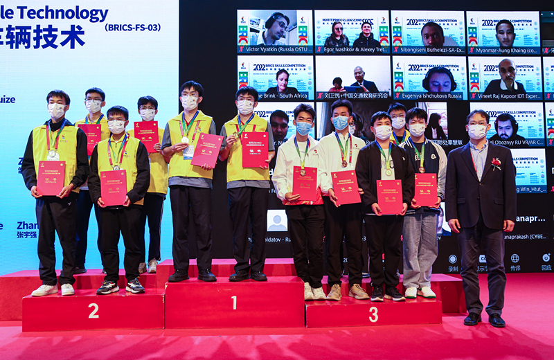 軌道車輛技術賽項是軌道交通行業第一個國際賽項,競賽內容全面對接世界技能大賽標準。大賽分為啟動賽和決賽兩個階段,其中啟動賽已于今年5月以遠程分布式競賽的形式舉辦。決賽中師生沉著應對、全力以赴,最終由于楊、王凱擔任指導教師,張惠澤、張勇2名同學組成的代表隊獲得金牌。