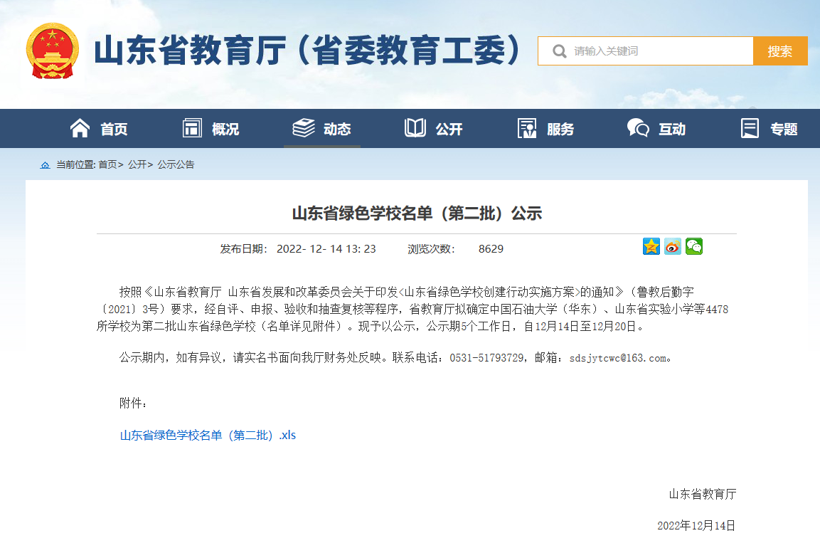 12月14日,山東省教育廳、山東省發展和改革委員會公布了第二批山東省綠色學校名單,我校成功入選。