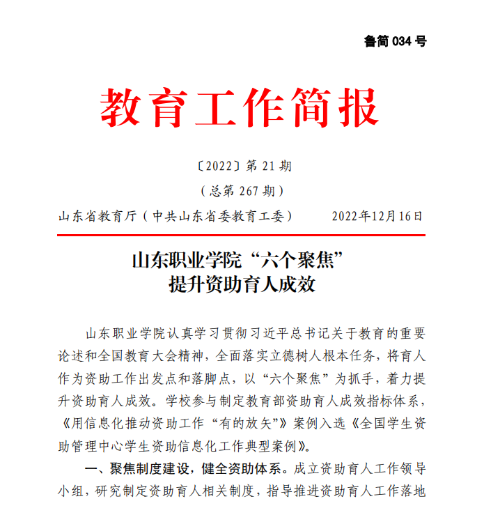 2022年12月,山東省教育廳《教育工作簡報》2022年第21期刊發我校資助育人工作案例《山東職業學院“六個聚焦”提升資助育人成效》,從“聚焦制度建設,健全資助體系”“聚焦平臺搭建,做好精準資助”“聚焦思政教育,強化價值引領”“聚焦勵志成長,提升綜合素養”“聚焦學風建設,發揮榜樣力量”“聚焦助困溫度,提供暖心呵護”六個方面對我校資助育人工作的經驗做法和育人成效進行了全面介紹,并向全省高校轉發推廣。