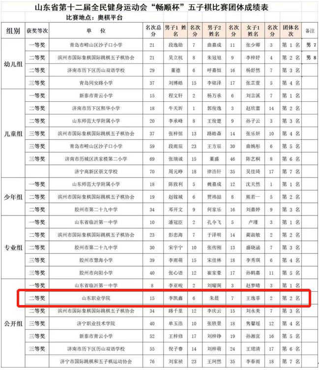 1月14日,“中國體育彩票”山東省第十二屆全民健身運動會“暢順杯”五子棋比賽圓滿落下帷幕。我校付叢睿同學榮獲男子專業組冠軍,王逸菲同學榮獲女子公開組亞軍,學校取得團體第二名的好成績。