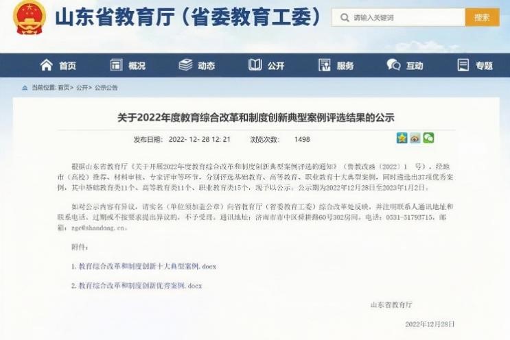 山東省教育廳組織開展的2022年度全省教育系統教育綜合改革和制度創新案例征集評選活動,旨在全面展示我省2022年度教育綜合改革和制度創新的成果,系統推進、持續深化教育綜合改革。經過嚴格、審慎的征集評審,分別評出基礎教育、高等教育、職業教育十大典型案例,并評出優秀案例37項。